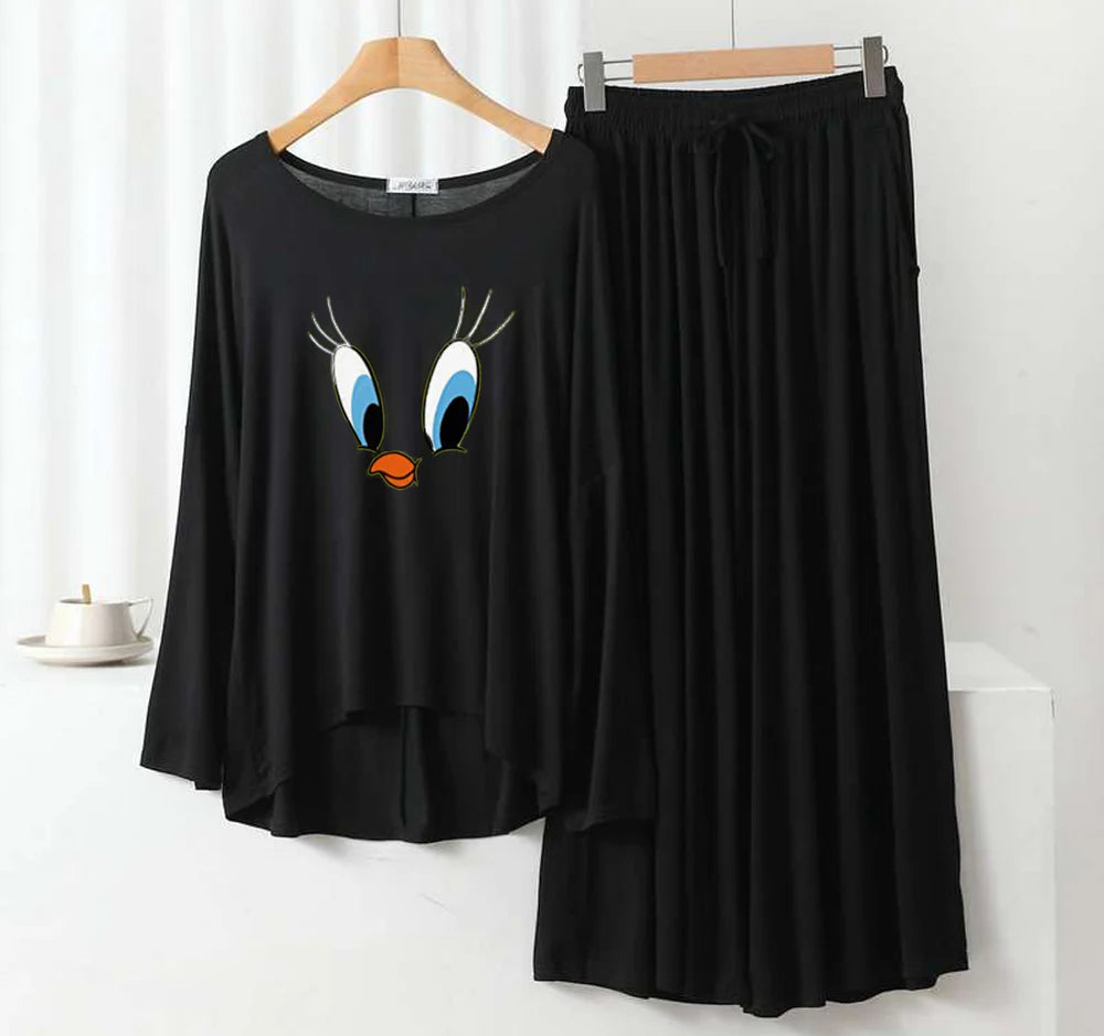 Deep Black Daffy Duck Round Neck Plazzo PJ Set
