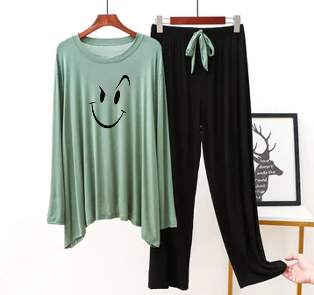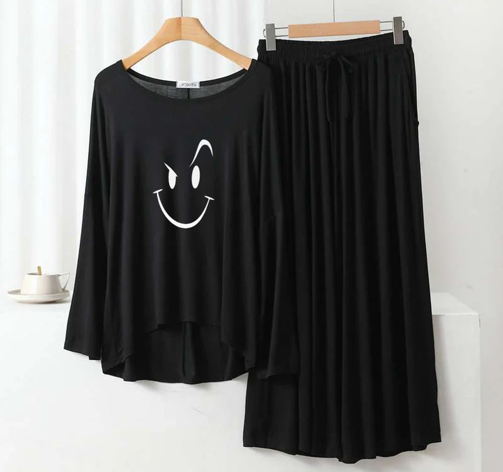 Deep Black Smiley Face Round Neck Plazzo PJ Set