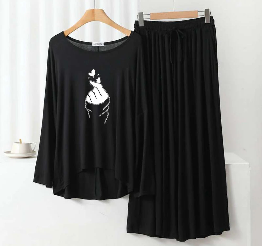 Deep Black K-Pop Heart Round Neck Plazzo PJ Set