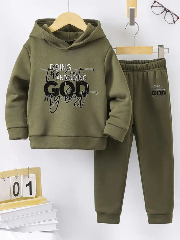 Color Drop-Shoulder Puzzle Printed Sweat Style 2-Pcs Winter Tracksuit